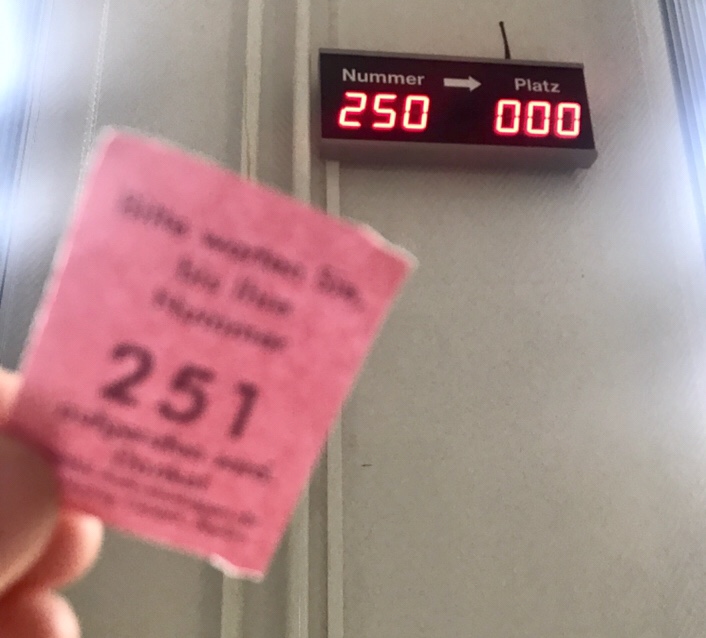 In typical German fashion, I had to take a number, fill out a form and wait. And wait. Someone asked me to take a twenty-five question multiple choice exam for B1, of which I got 12 answers correct. Then I went back to the room and waited some more.