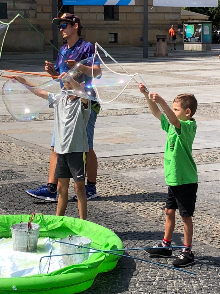 The kids played with the giant bubbles while Dave and I relaxed on the steps of the concert hall while several hop on hop off double decker buses stopped at the square.