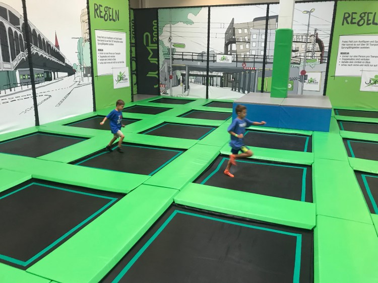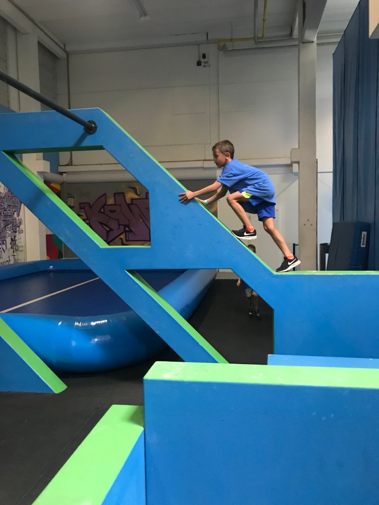 After lunch, the boys and I headed out on an epic journey to a trampoline and Parkour park. Epic, because it took an hour, via two trains and a bus, to get there. Thankfully the bus was air conditioned. Unfortunately, the fun park was not.