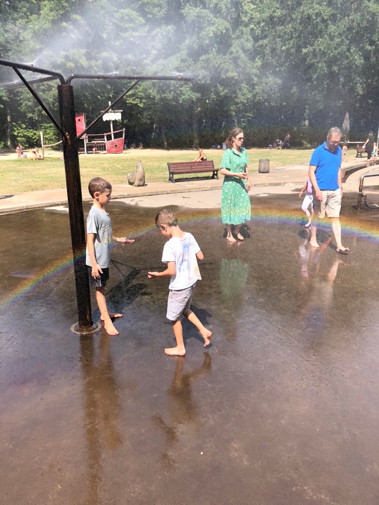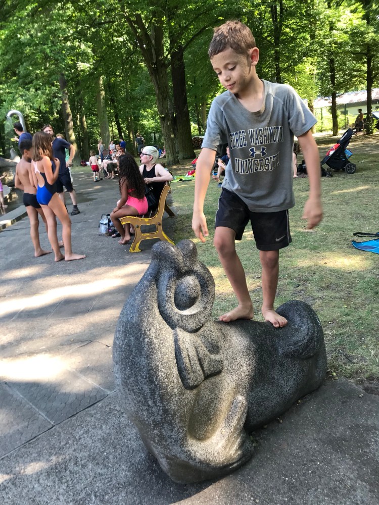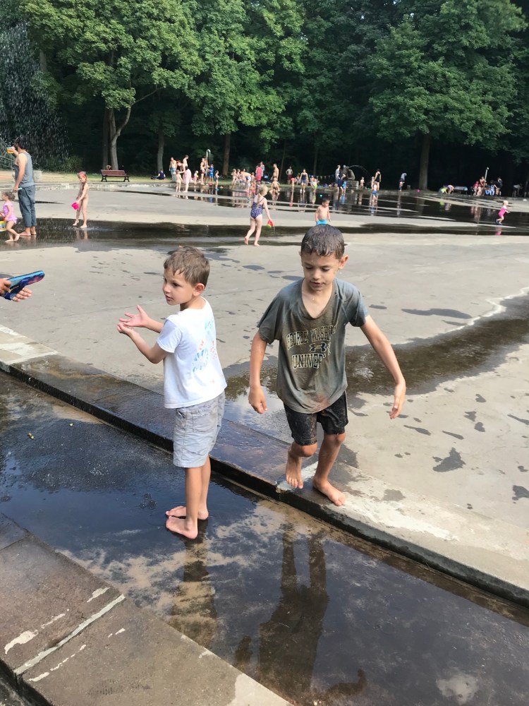 Since it is going to be another hot day, we go to a splash pad playground of sorts in Plänterwald near the Spree.