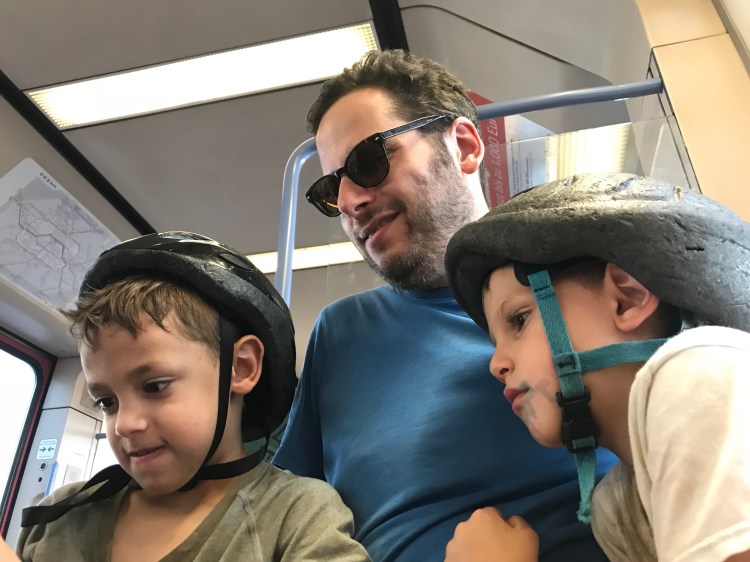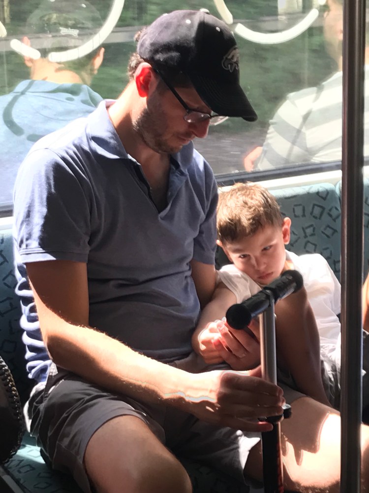 {Daddy and Isaac on the S 41 to the bus to Plänterwald}