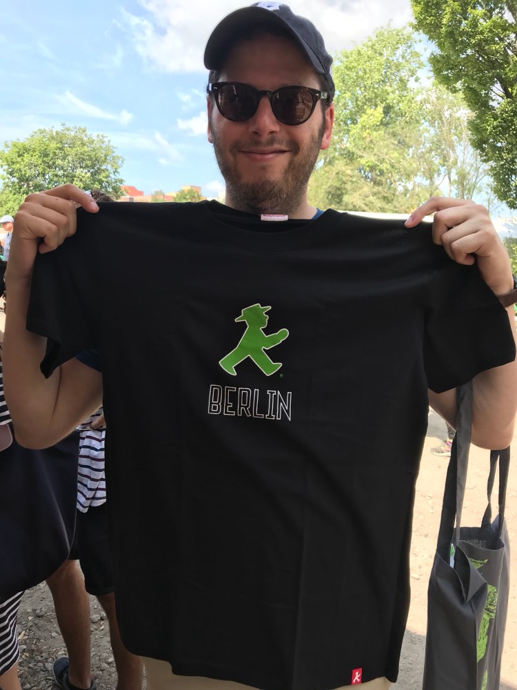 After our ride, we met Dave at the playground. We then browsed the flea market. I got a fanny pack and sunglasses and Sam picked up a present for a friend, an original painting of Berlin by an architect who now does art instead and an Ampelmann T.