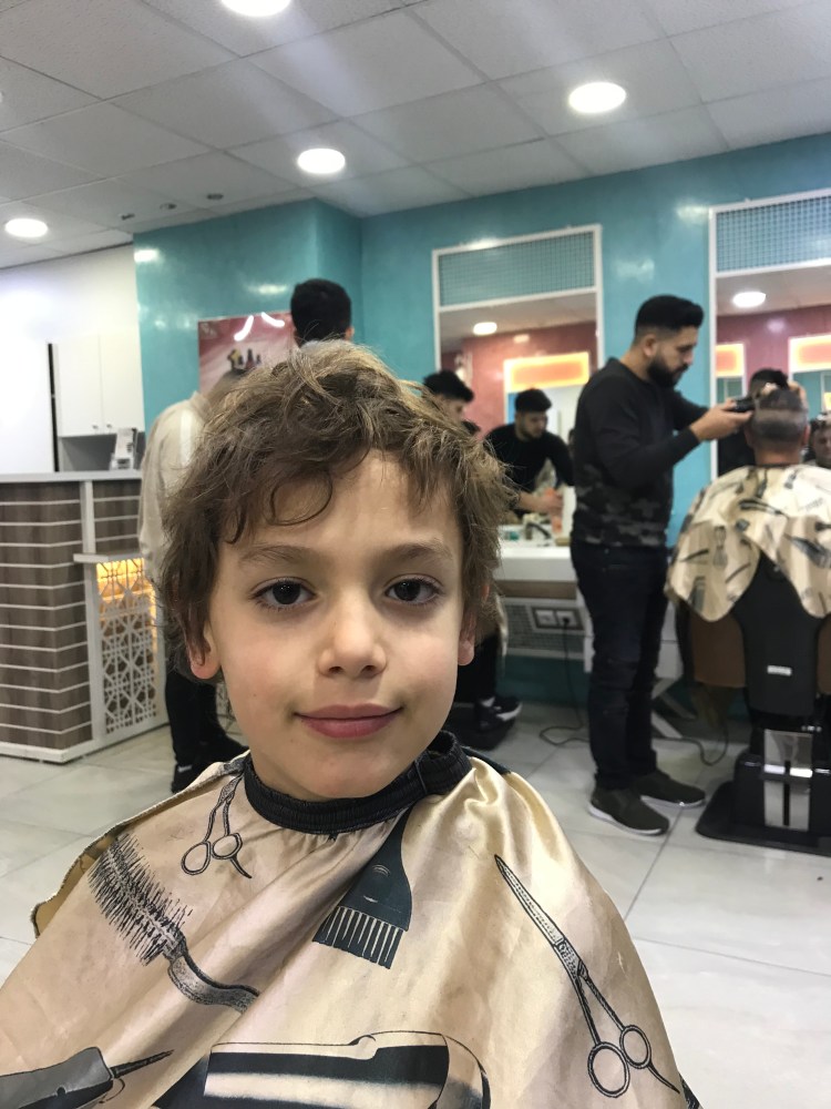 The barbers were super cool, most of Turkish background, I would guess. And there were raps videos on the TV. Guys were getting their eyebrows threaded (I doubt he caught that). Plus, they were the only kids there.