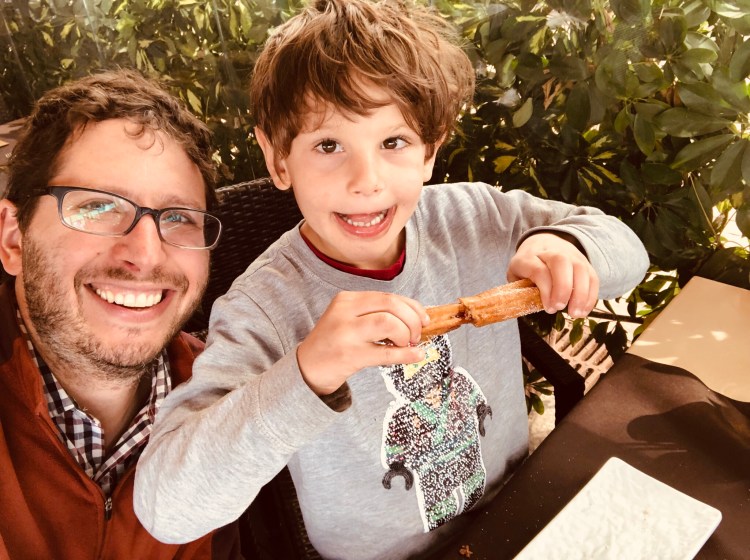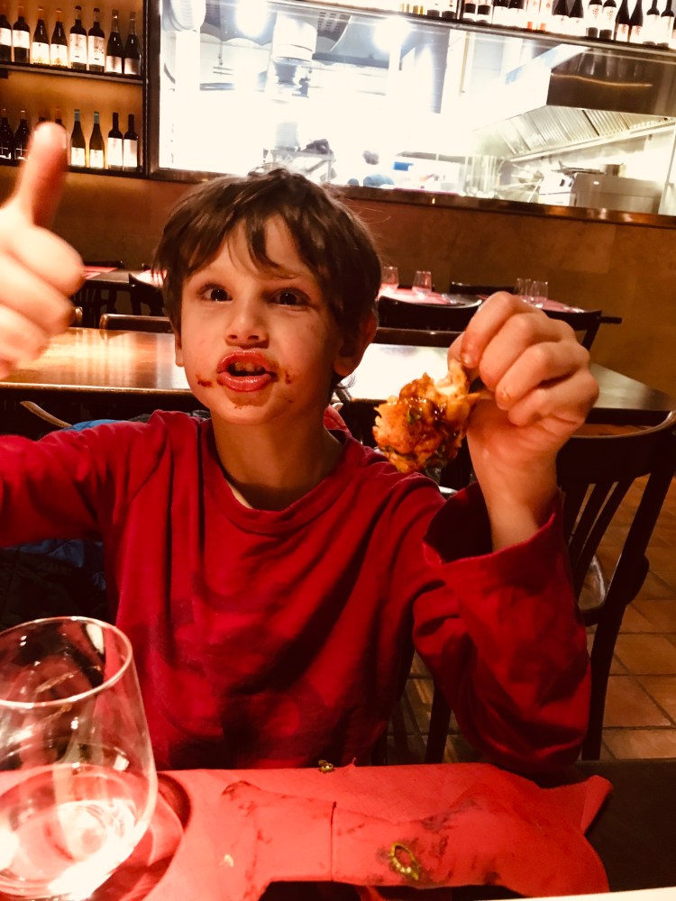 {Isaac gives our first meal in Barcelona a thumbs up}