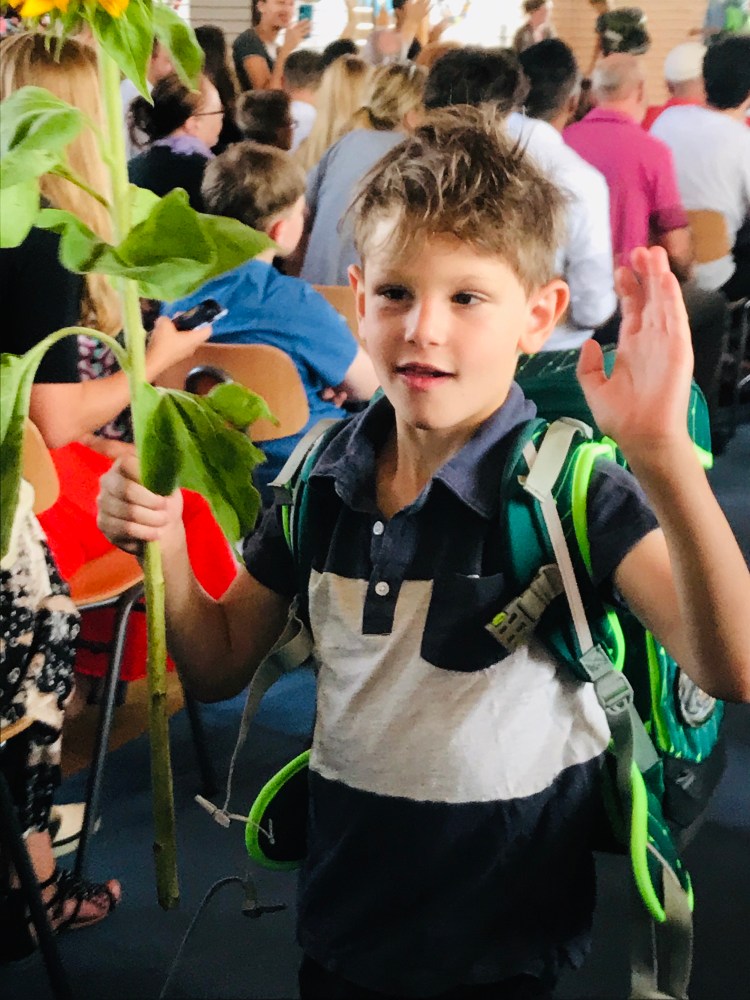 {Isaac waiting for his Einschulung ceremony to begin at school}