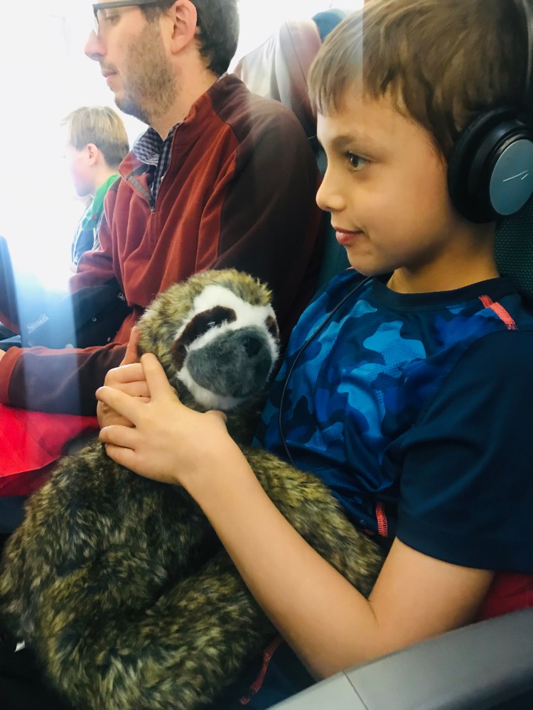 {Benny, with Sammy the Sloth, ready for take off}