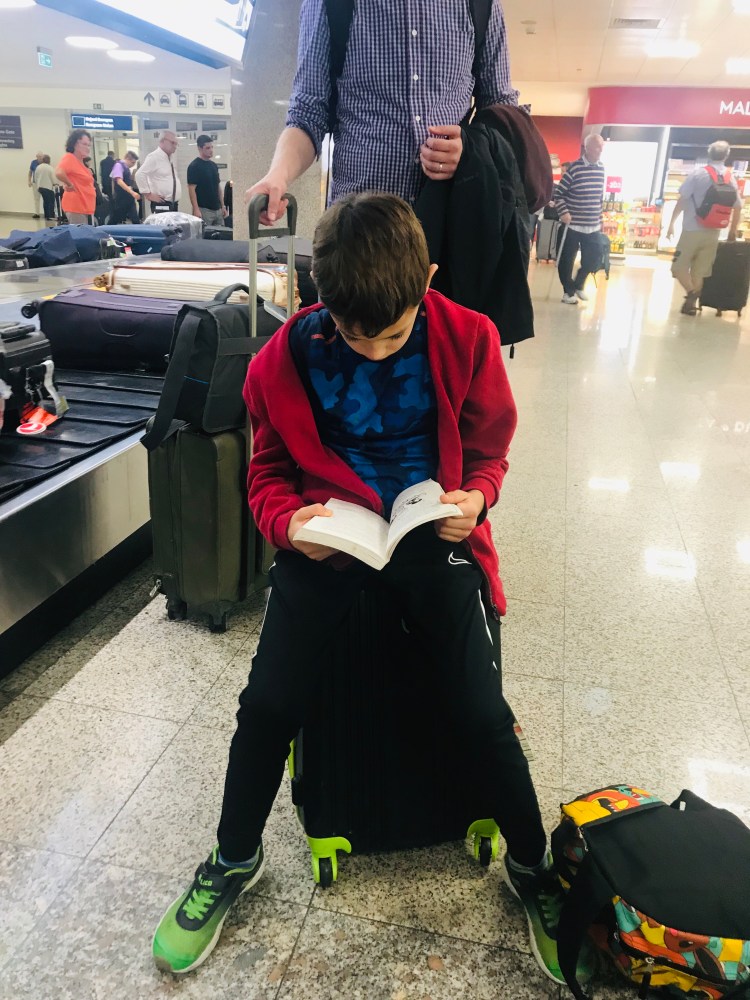 {Ben is a BIG reader now and finished a few pages while waiting for our luggage to arrive in Malta.}