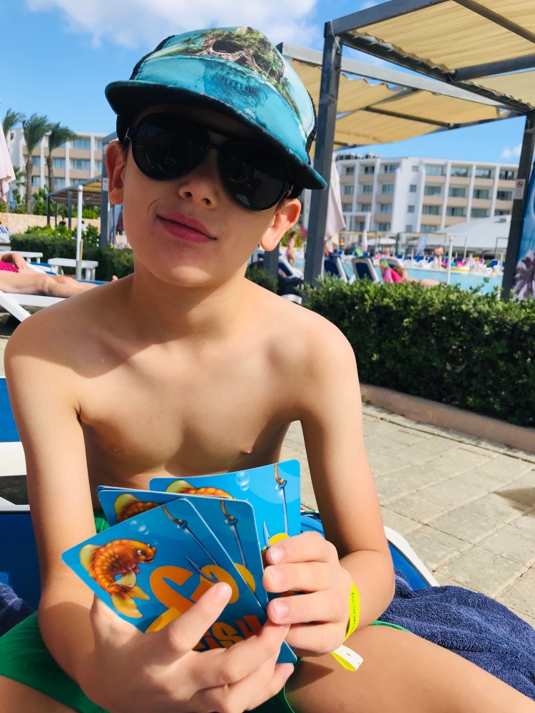 {Relaxing by the outdoor pool. We played a lot of Go Fish during our trip.}