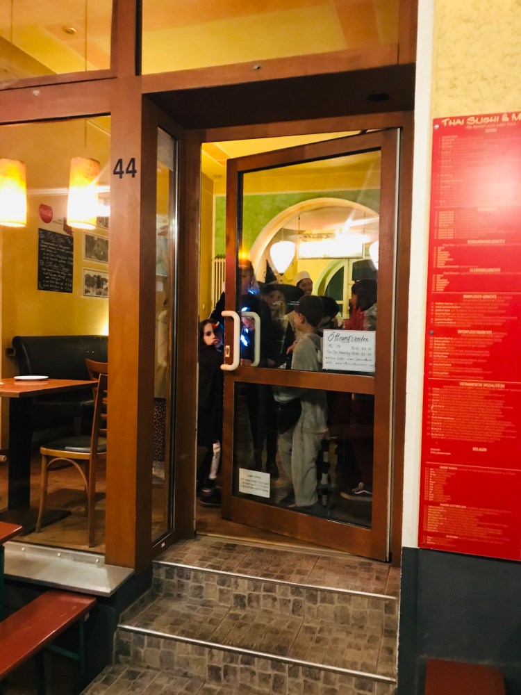 The group of neighborhood kids then formed a little pack and went up and down Kastanienallee (Chestnut Avenue) to various businesses hoping for treats. They were in luck. They scored candy, packs of gum and even fish wafers from a Thai restaurant. Ha! The adults were tempted to ask them to request beers for us at the Spätkaufs (convenience stores), as open containers are allowed in Berlin.