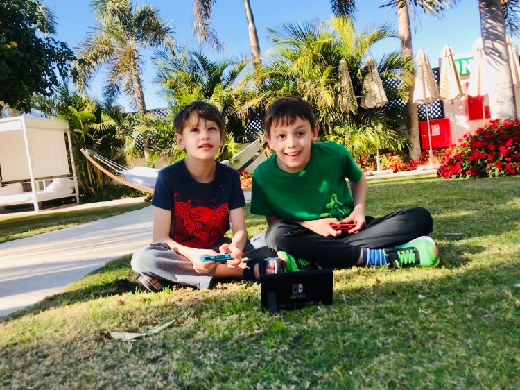 {Boys playing their new gaming system by the pool – they were in heaven}