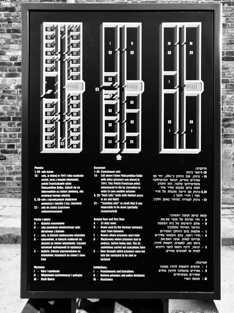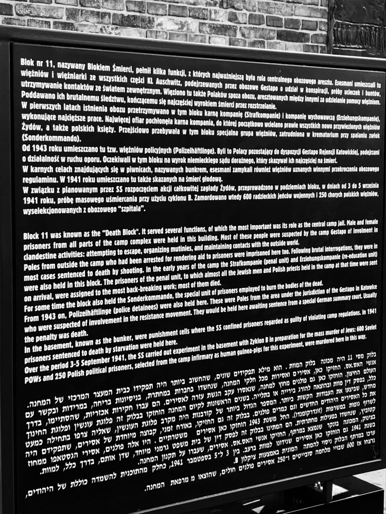 We were told about the inhumane ways prisoners were tortured. It was excruciating to hear. Then we went inside cell Block 11. There were cells measuring one meter by meter in the basement. Here, prisoners were forced to crawl through small doors only to stand four at a time in these windowless cells. If a prisoner was caught trying to escape Auschwitz, he would be sentenced to nine days and nights here. One of the cells was the starvation cell where prisoners stood without food or water until they died.