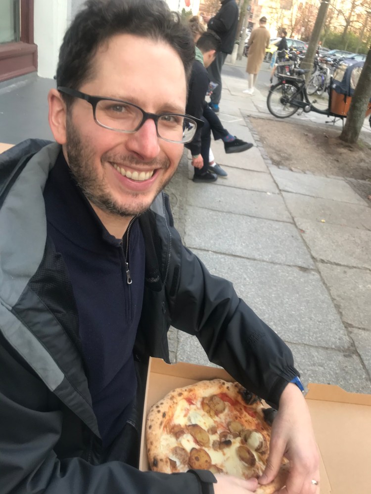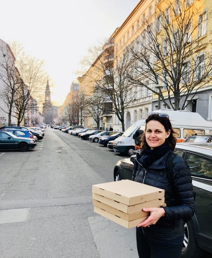 {Heading home with the pizzas with Zionskirchplatz in the background}