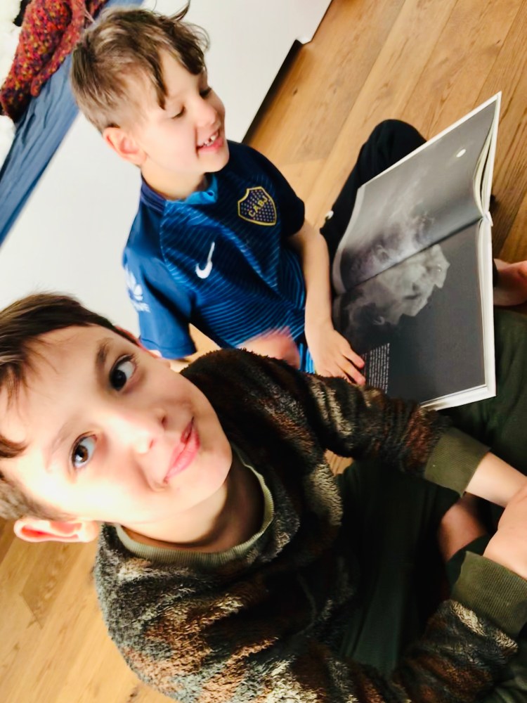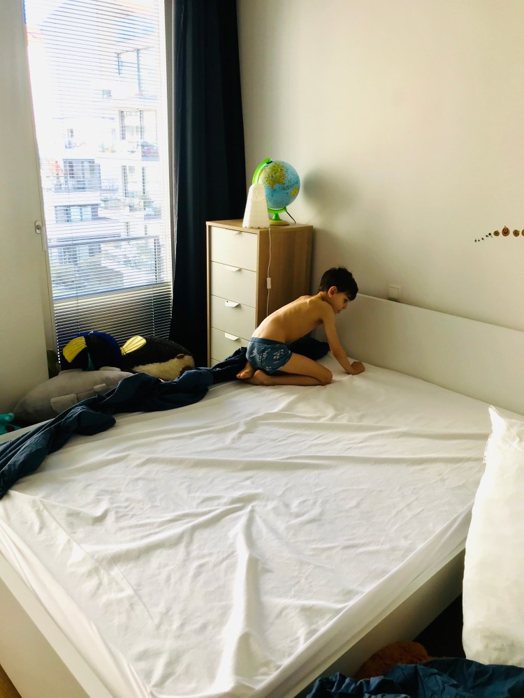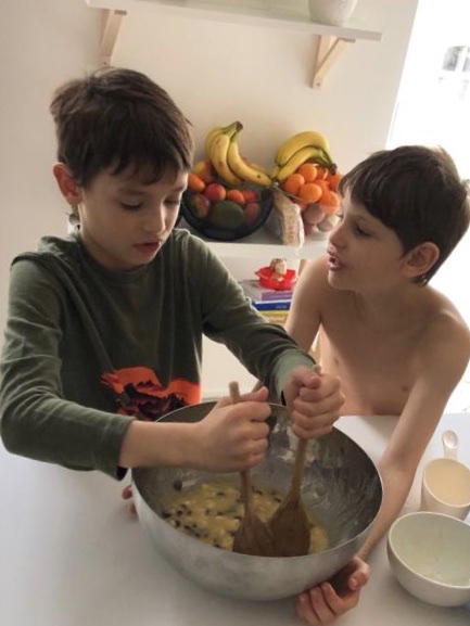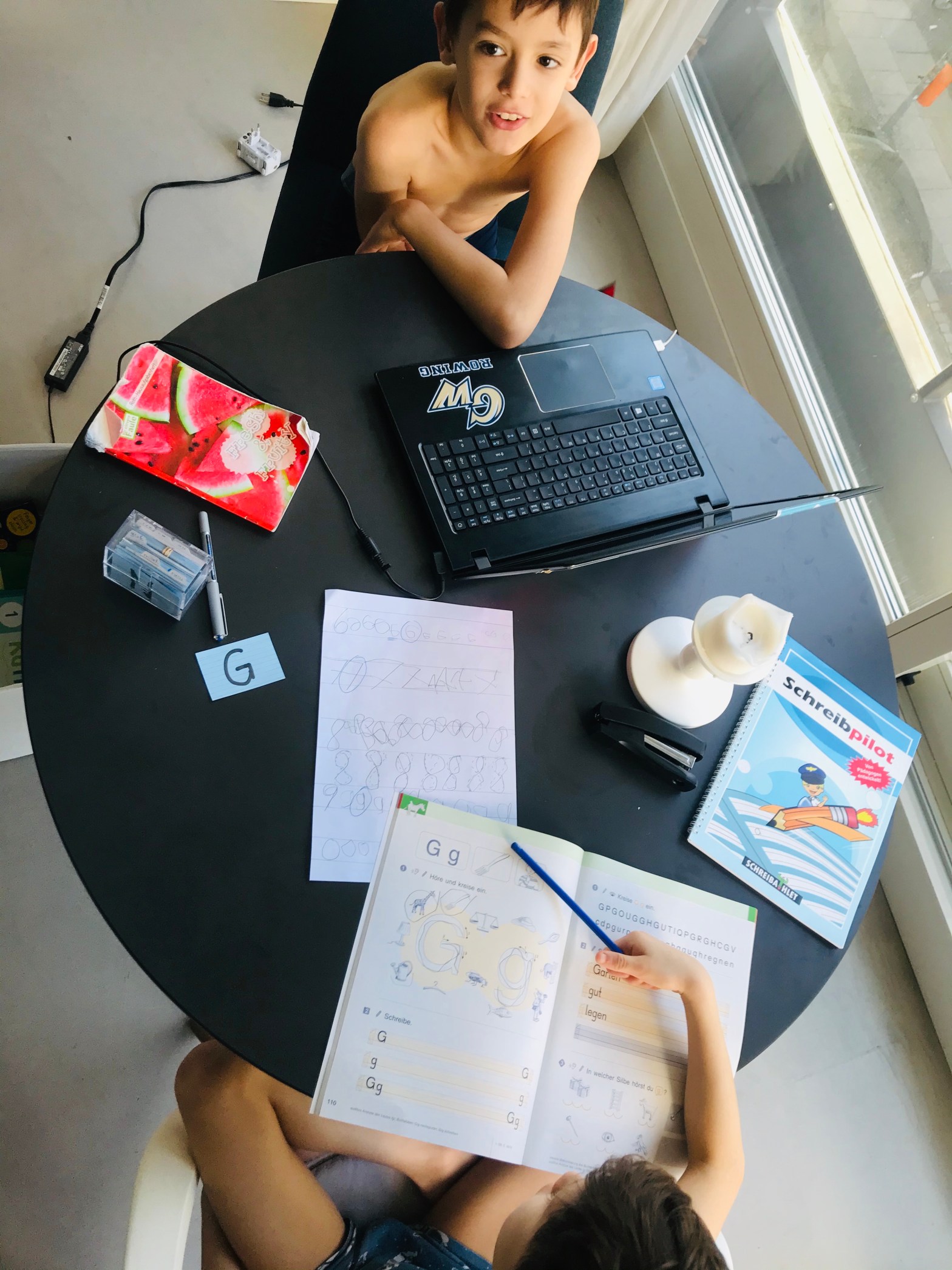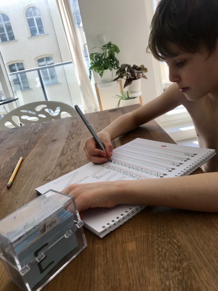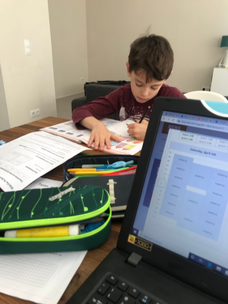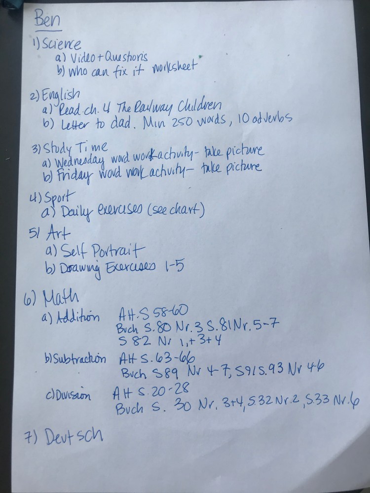 With no official homework yet sent from the school, I used the boys’ school books and notebooks to creative custom lessons in Math, German and English. They each did an hour of work in their notebooks and on-line followed by watching some videos Ben’s German teacher had recommended.