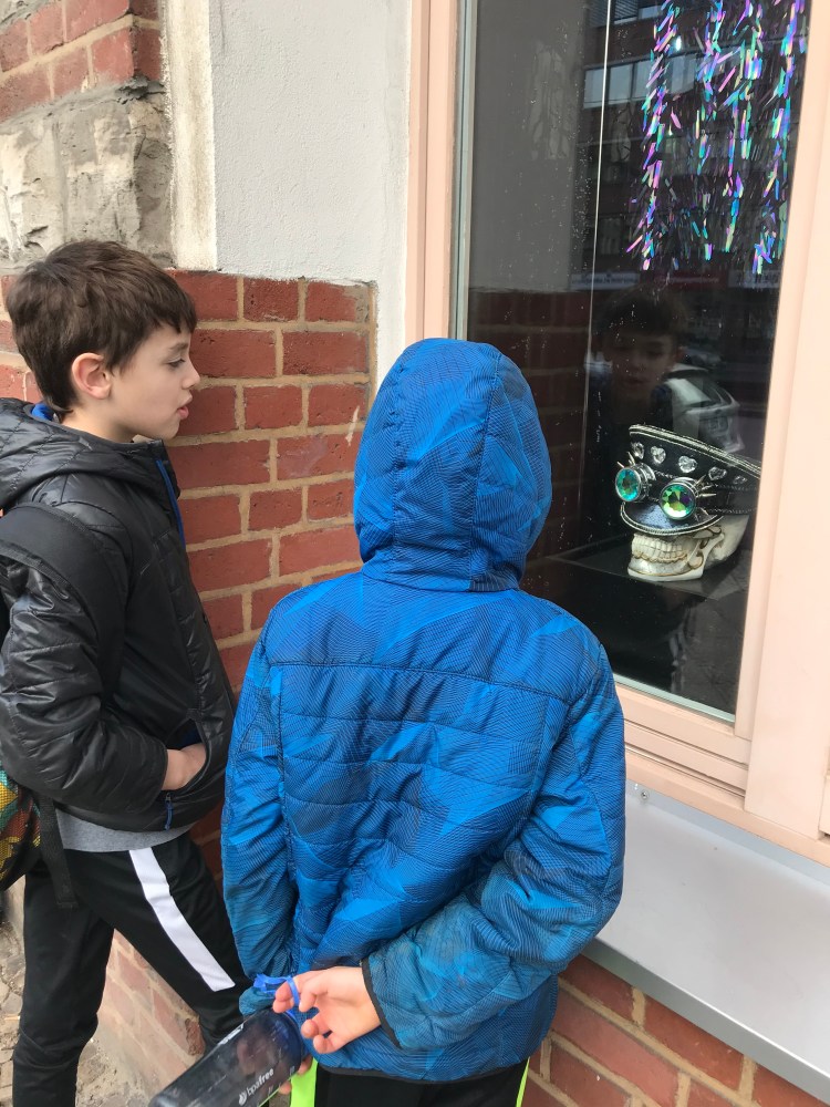 {Distractions on our way home – notice the fine print on the shop window}
