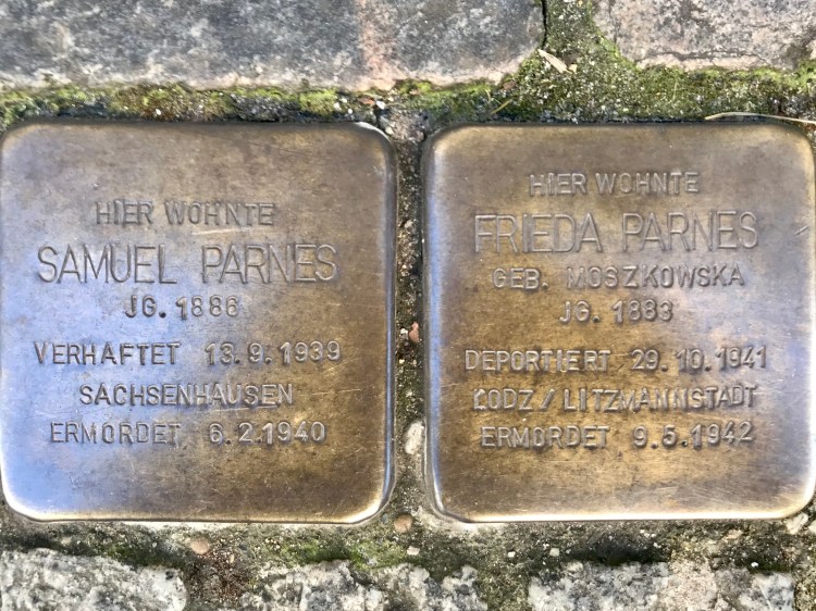Stolpersteine (stumbling stones) is a project of the artist Gunter Demnig. The project commemorates people who were persecuted by the Nazis between 1933 and 1945. Their names and fate are engraved into a brass plate on the top of each Stolperstein.