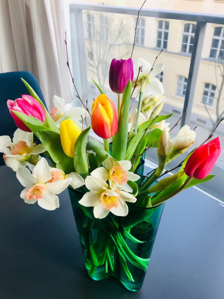 I also stopped by Rewe on the way home (I know, major hamstring here) and picked up some tulips, BBQ and lettuce. Again, I encountered tape on the floor keeping people 1.5 meters apart. I also noticed plastic barriers separating the cashier and the guest with little holes cut out to reach the credit card machine. Most stores are only accepting plastic now.