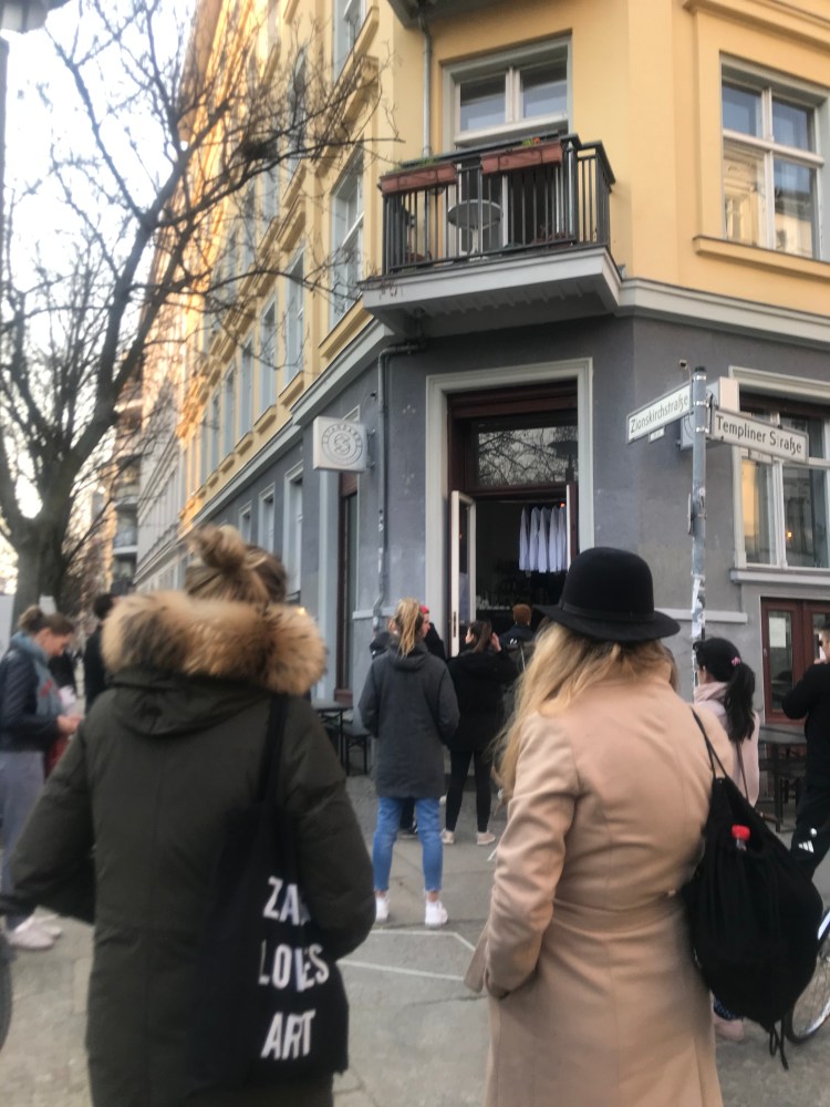 I picked up some rotisserie chicken and grape leaves for dinner from the Rosenthaler Grill and picked up some bread from Zeit für Brot. Sarah demonstrated how to stand 1.5 meters back from the next customer using the tape on the floor as a guideline.