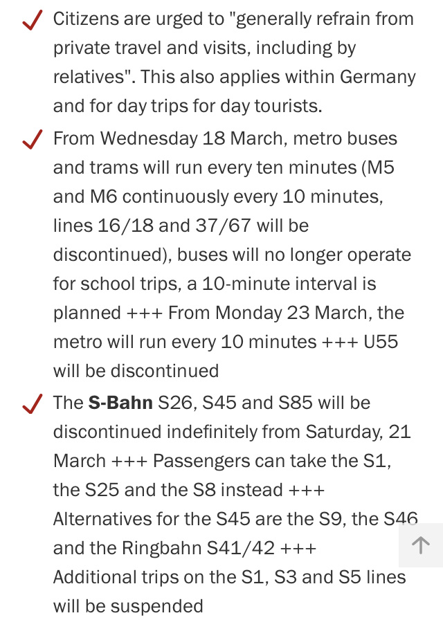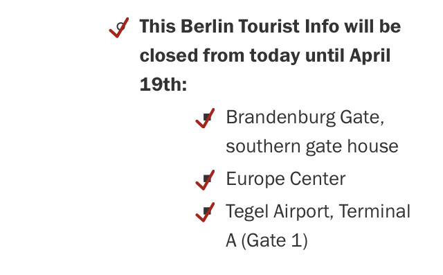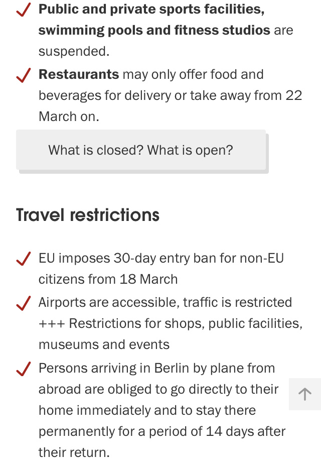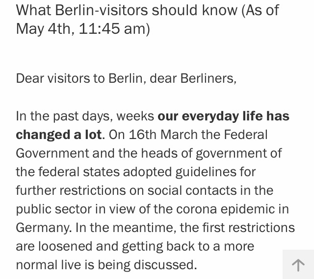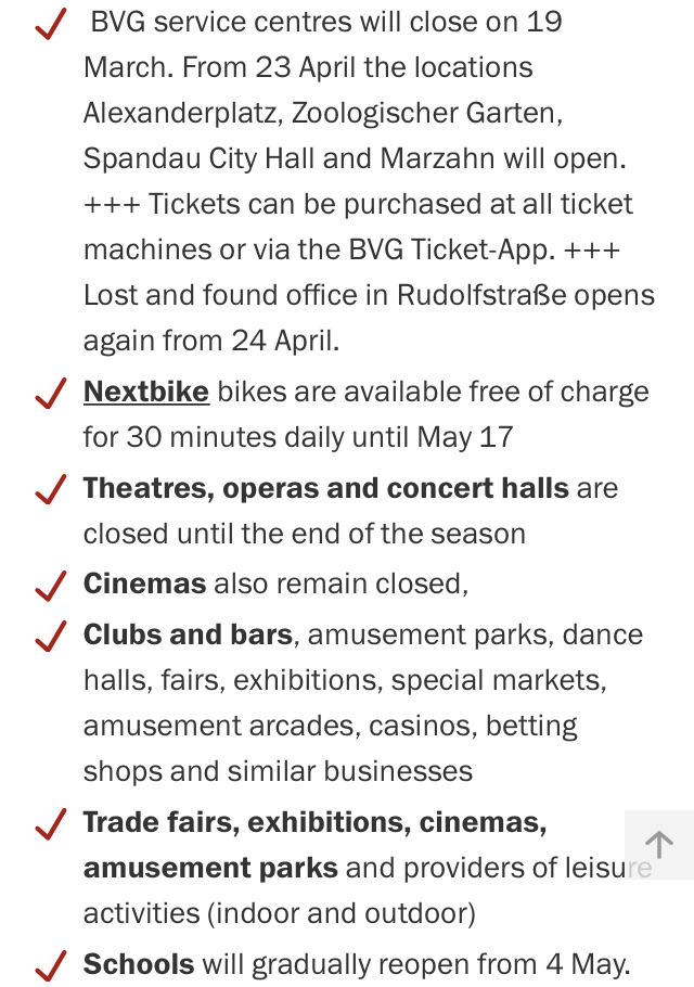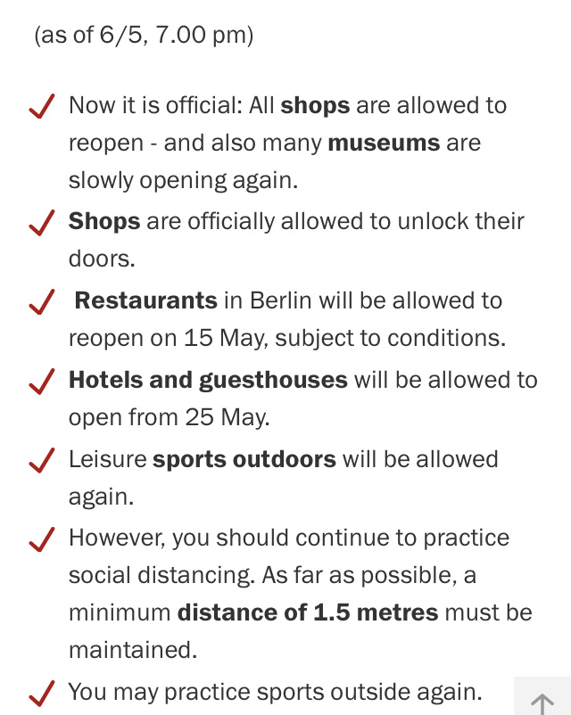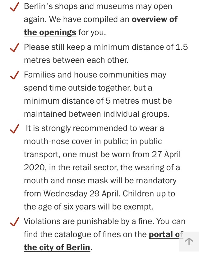 We are waiting to hear how things change when Merkel meets with her state representatives on May 6. Until then, this is the current status of life in Berlin.