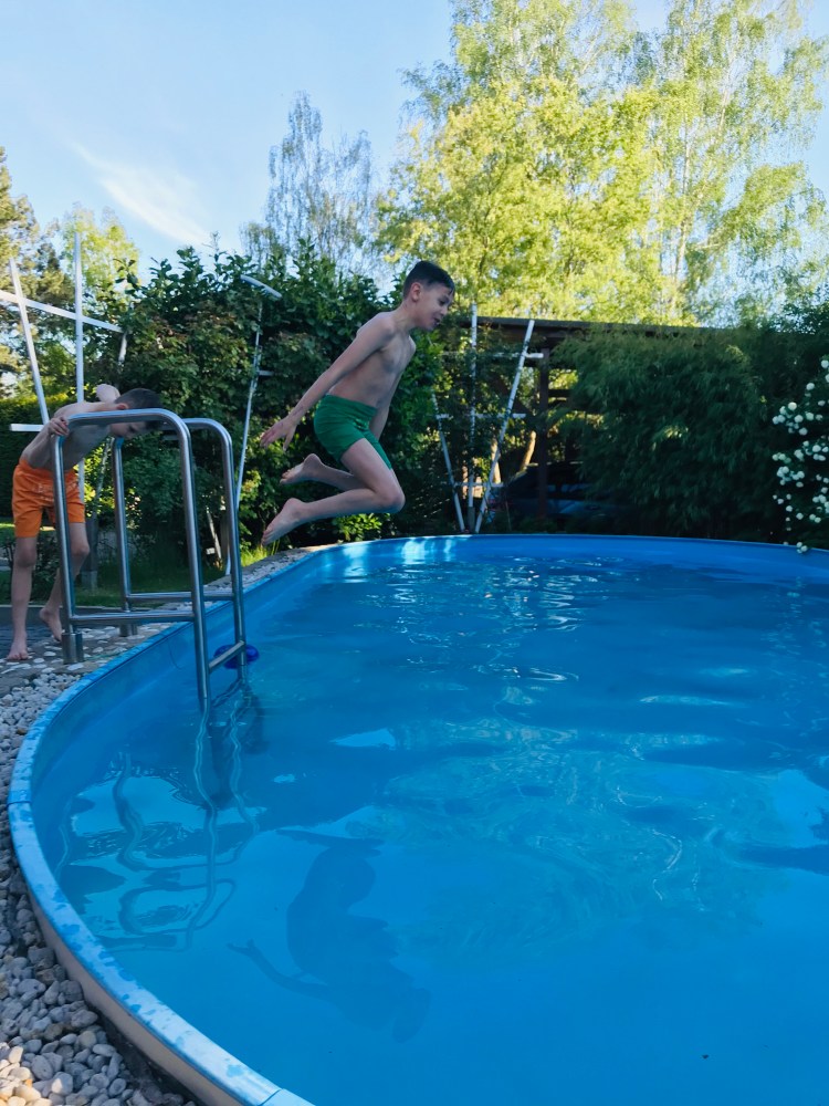 {Swimming in our cottage’s pool}
