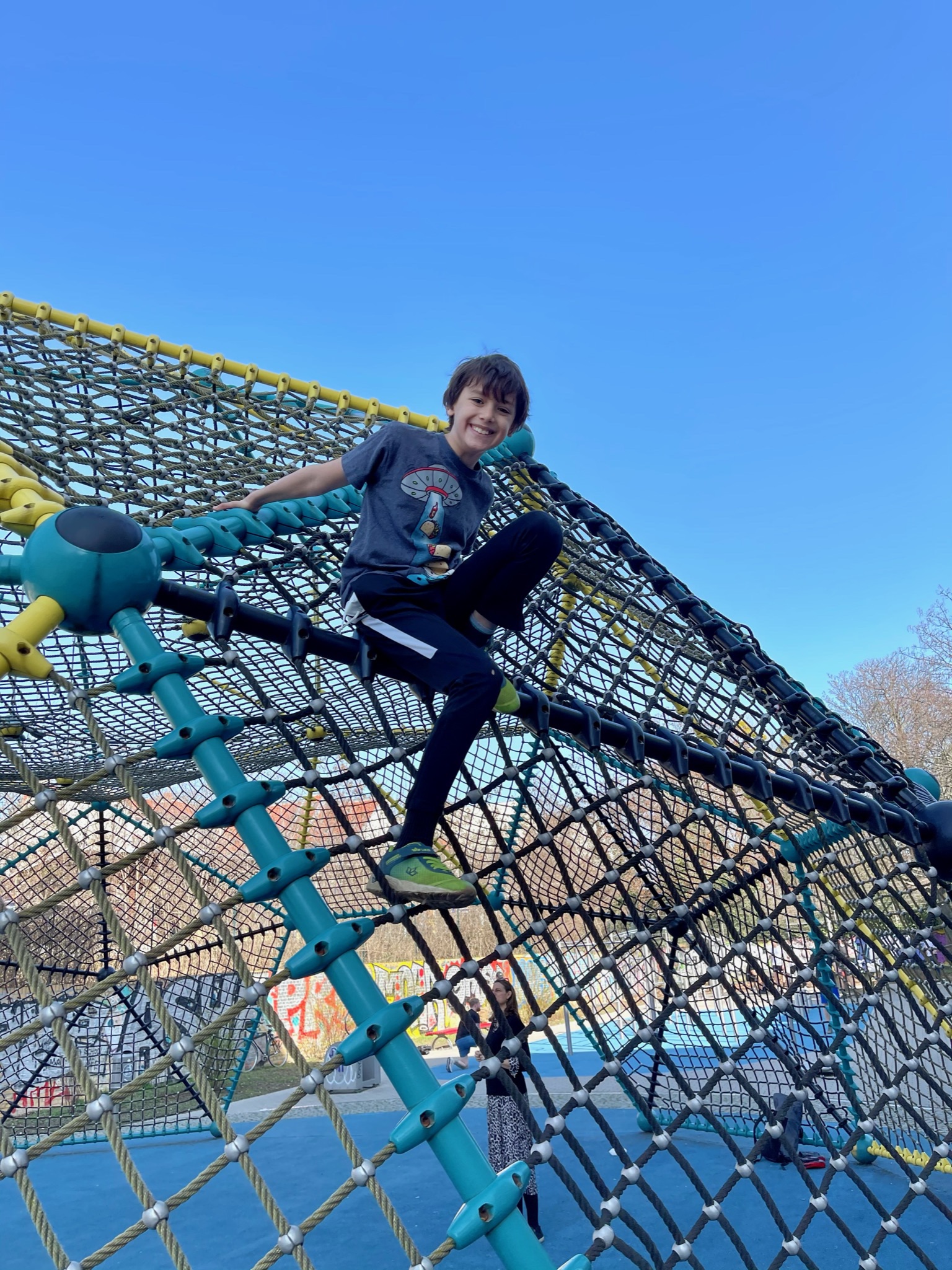 This playground centers around a huge climbing structure. I called the boys little spiders as they skittered up and down.