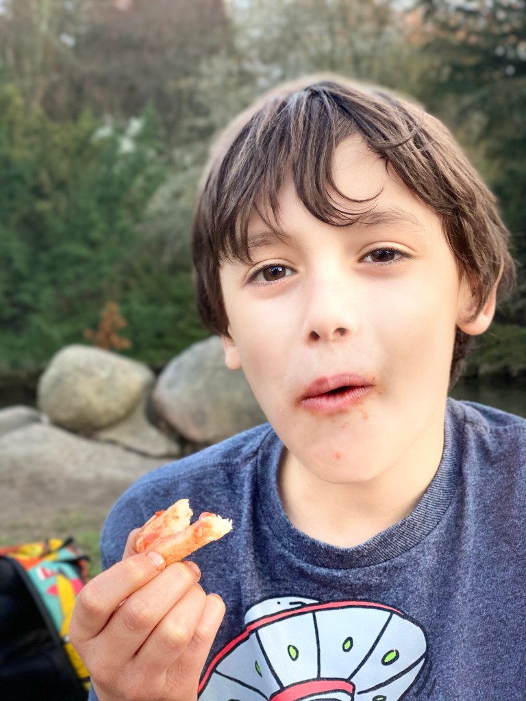 After another trip to the waterfall and some time looking for Froggie (who could not be found), we settled in for a dinner of pizza on our picnic blanket at the bottom of the waterfall.