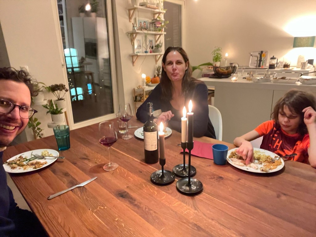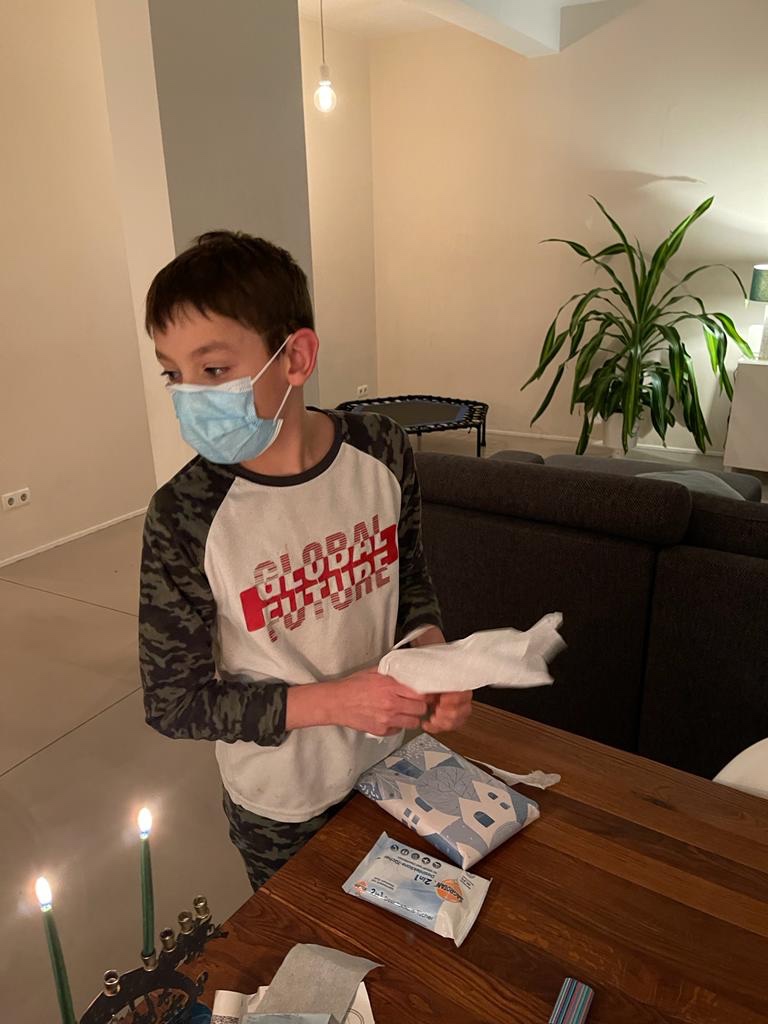 He coordinated my medical care. Ran back and forth to the Apotheke (pharmacy). Wrapped Hanukkah presents. Brought me fresh fruit and tea every day. Picked up an oximeter and care package from a friend. (Thank you, Audrey!) Went up to Pankow to get Isaac’s books from school. Ordered whatever we needed from those quick delivery folks. Did the family cooking, cleaning, laundry, dishes and grocery shopping. Homeschooled the boys. All while sleeping on the sofa bed in the office. I’m sure there is more, but I was stuck in bed and was so sick to notice much.