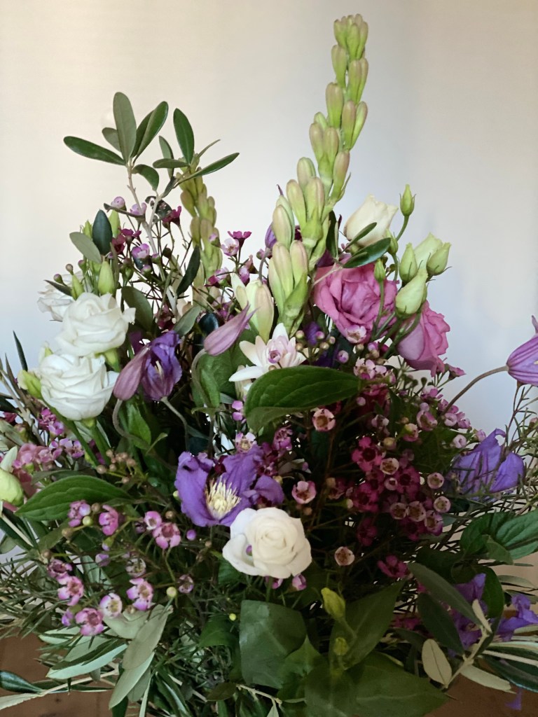 I also want to thank my in-laws (John and Martha) for the gorgeous roses, my book club for the stunning bouquet containing my favorite color, and our upstairs neighbor, Julie, for the plants and treats she brought to me, which greatly brightened my days.
